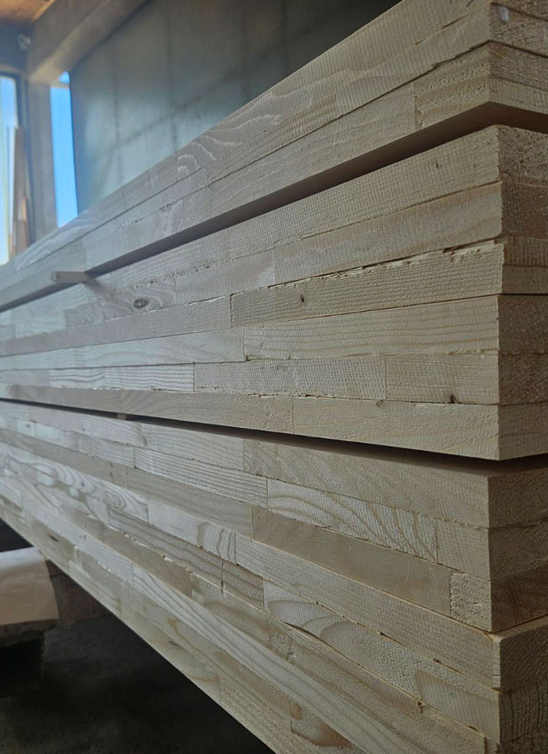 Lijepljeni elementi se izrađuju sa posebnom pažnjom od samog početka procesa proizvodnje. Koristimo posebno birane trupce gdje se fokusiramo na kvalitet i veličinu. Prije lijepljenja elementi prolaze kroz pažljiv proces hoblanja što osigurava ravniju površinu i bolje lijepljenje.